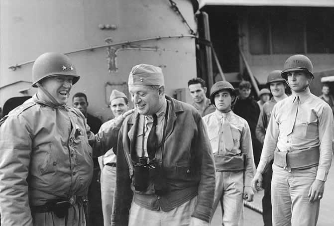 ARMY COMMANDER MGEN. GEORGE S. PATTON, AND NAVY COMMANDER RADM. H. KENT HEWITT, ON BOARD SHIP DURING THE NORTH AFRICAN CAMPAIGN. PHOTO DATED 4 DEC. 1942.
