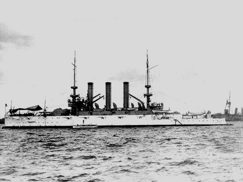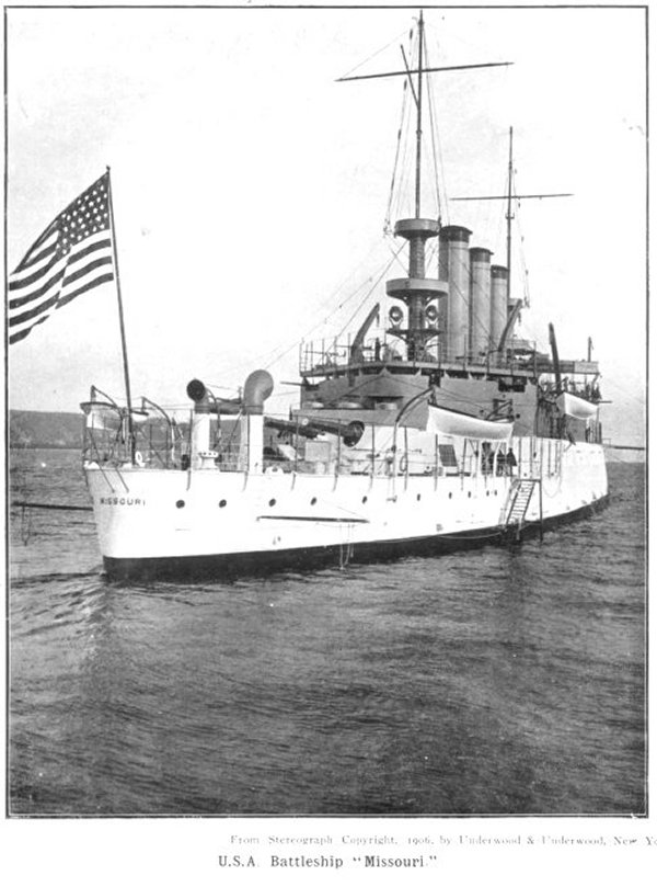 Missouri (BB-11) during the Jamestown Exposition naval review in Hampton Roads, Virginia, May 1907.