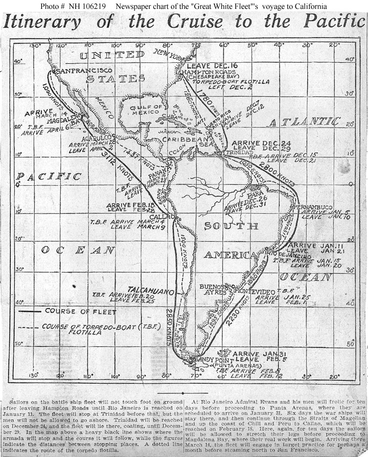 Chart from a contemporary newspaper, showing the route to be taken by the Atlantic Fleet's battleships and their associated Torpedo Flotilla, from their December 1907 departure from Hampton Roads, Virginia, until their planned arrival at San Francisco, California, in the spring of 1908. Text below the chart indicates that it was published in mid-December 1907.